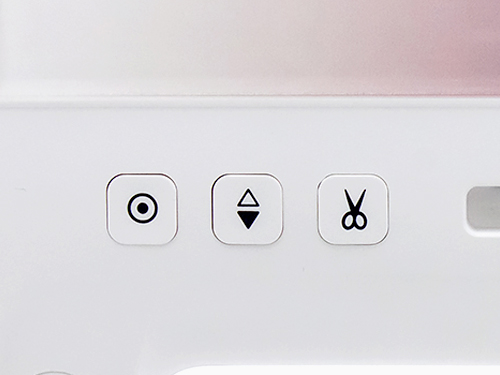 При нажатии на кнопку нити будут автоматически обрезаны, вам не придется делать это вручную. Также под дисплеем вы найдете еще одну кнопку, нажатие которой позволяет обрезать нити после выполнения стежков закрепки. После этого вам не нужно вытягивать шпульную нить, вы можете сразу опять приступать к шитью. Невероятно удобно!